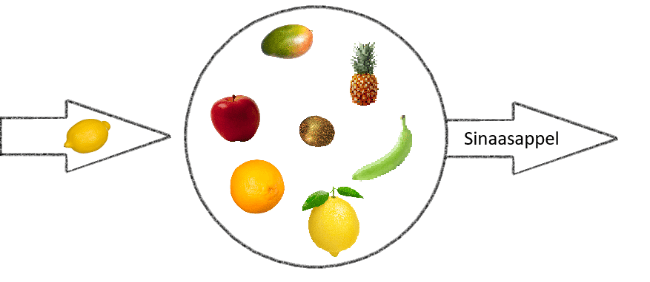 De afbeelding hieronder toont het herkennen van fruit door een ondermaats getraind netwerk. Er wordt gevraagd om een citroen te herkennen, maar het model kent alleen appels. Met de beschikbare kennis, geeft het netwerk als antwoord ‘Appel’.